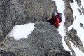 plezanje, iskanje prehodov in prečenje grebena do vrha v močnem vetru,