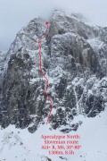 - Apocalypse North (2750 m): Slovenian route, Ai4+ R, M6, 50°-80°, 1300 m, 8,5 h (vzpon na neosvojen vrh)