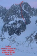 - Seraph (2650 m): The Last Supper for snow strugglers, M7/M4-5, 50°-80°, 700 m, 7 h