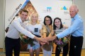 Od leve stojijo: predsednik uprave Prve Janez Kranjc, Janja Garnbret, članica uprave Prve Nataša Hajdinjak, Mia Krampl in predsednik PZS Jože Rovan