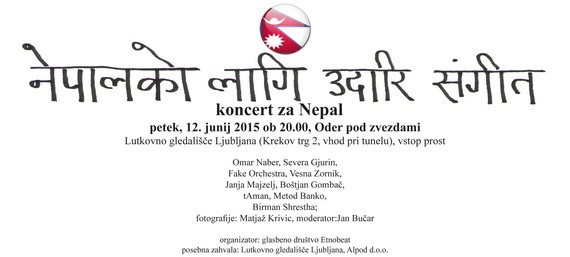 sreda, 10. junij 2015, ob 20. uri, ogledov: 2910 Koncert za NepalSplošno | | | Objavil(a): Matej Ogorevc | | Glasbeno društvo Etnobeat ob podpori Lutkovnega gledališča Ljubljana na Odru pod zvezdami prireja dobrodelni koncert za Nepal. |
