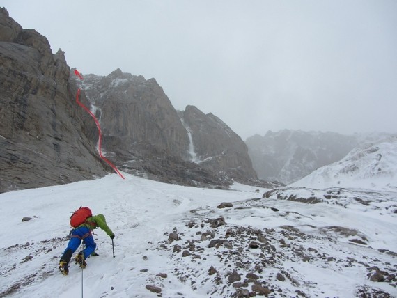 Naš prvotni plan je bila smer v JZ steni Kyzyl Askerja, ki leži na Kitajskem. Med potjo do baznega tabora smo izvedeli, da so Kitajci ravnokar aretirali dva Rusa, ki sta na istem območju prečkala mejo. Ker nihče od nas ni čutil kakšne velike želje biti bodoča zvezda oddaje Banged up Abroad in China smo se prav na hitro odločili, da postavimo bazo en ledenik bolj zahodno, ki je na pogled obetal zanimivejše cilje na Kirgiški strani. Posledično pa nismo imeli skoraj nobenih informacij o ciljih nad ledenikom.