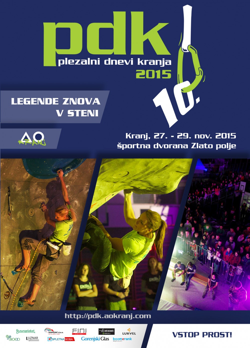 sreda, 25. november 2015, ob 9. uri, ogledov: 3289 10. Plezalni dnevi Kranja - legende znova v steniŠportno plezanje | | Komisija za športno plezanje | | Planinsko društvo Kranj | | | Objavil(a): Manca Ogrin | | Slovenski športni plezalci, ki se po svetu merijo z najboljšimi plezalci in pri tem dosegajo odlične rezultate, se bodo zadnji novembrski konec tedna potegovali še za zadnje točke v seštevku tekem državnega prvenstva. Od petka, 27. 11. 2015, do nedelje, 29. 11. 2015, bo namreč potekal finale državnega prvenstva v športnem plezanju ali krajše 10. Plezalni dnevi Kranja. Letošnji bodo še posebej zanimivi, saj smo, kot se za obletnico spodobi, osvežili spremljevalni program, zato 10. PDK nikakor ne kaže zamuditi. |