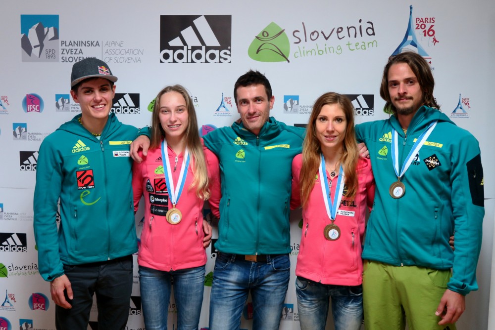 Člani slovenske reprezentance v športnem plezanju na SP Pariz 2016: Julija Kruder, Tjaša Slemenšek, Janja Garnbret, Rebeka Kamin, Mina Markovič in Tjaša Kalan ter Jernej Kruder, Martin Bergant, Gregor Vezonik, Urban Primožič in Domen Škofic