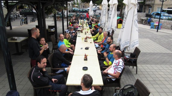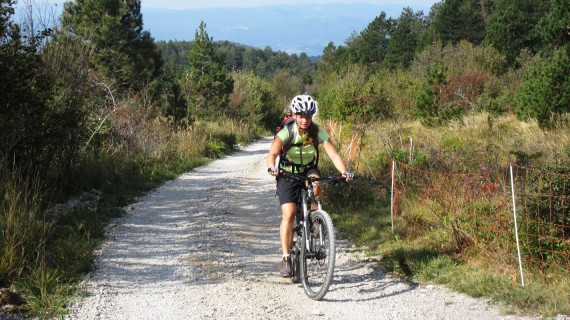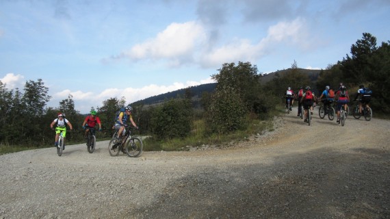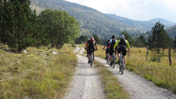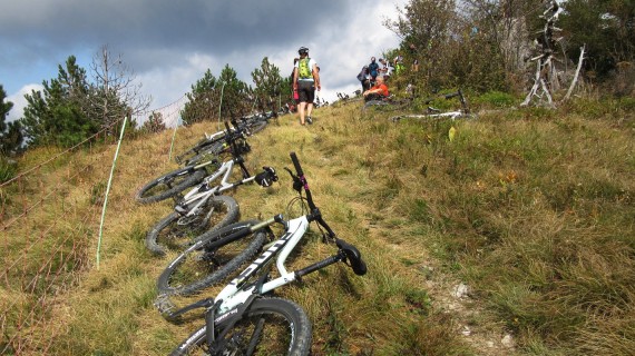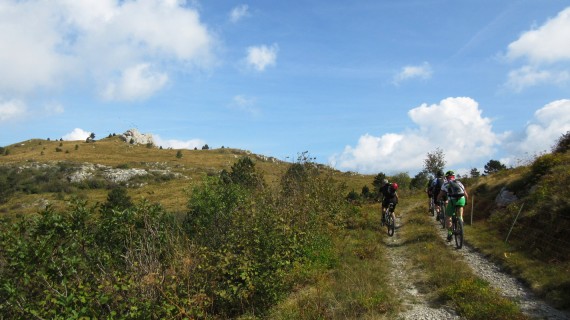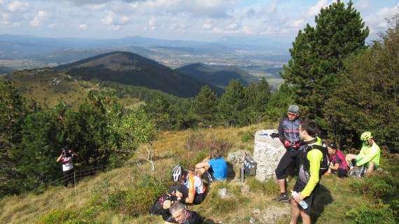 Po okrepčilu, uživanju razgledov, obveznem fotografiranju in odtisu za mnoge prvega žiga v Dnevniku STKP (hvala Jocu, ki je poskrbel za ustrezno količino novih dnevnikov), smo se najprej spustili preko travnate planote vzdolž linije bunkerjev Alpskega zidu, zatem pa nadaljevali po makadamski cesti nad Mrzlim dolom, vse do Bistriške bajte v križišču z asfaltno cesto Ilirska Bistrica–Sviščaki. Cesto smo zgolj prečkali, nato pa je sledil resnično lep spust mimo Štange in Kozleka v vasico Jasen, ki je potekal po razgibanih stezicah in vlakah, katere so nam odkrili in pripravili prizadevni ilirskobistriški gorski kolesarji! Kot so nam zaupali, se tudi sami lotevajo vzpostavitve turnokolesarskega odseka pri PD Snežnik Ilirska Bistrica, pa tudi sicer je kolesarstvo kot turistični produkt z velikim zelenim potencialom vedno bolj prisotno v teh krajih.