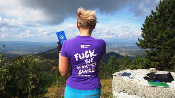 Če je bilo na vzponu skoraj prevroče, pa je bilo na vrhu, ki smo ga zgledno osvojili peš, ravno prav vetrovno, da so se majice hitro sušile in strani v Dnevniku STKP kar same obračale do kvadratka za žig št. 51, ki je nameščen na skrinjici tik ob stebru na vrhu Velike Milanje! Malo pod vrhom, v okolici razglednega skalnega osamelca, imenovanega Zob (med zaključnim vzponom je pogled nanj dejansko spominjal na obliko gigantskega podočnika), smo komajda našli dovolj velik prostor za skupinsko fotografijo - podrobno štetje očeladanih glav, doma na 24-palčnem monitorju, je namreč razkrilo kar 39 kolesarjev in eno štirinožno tekačico, simpatično psičko Belo.
