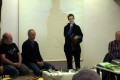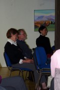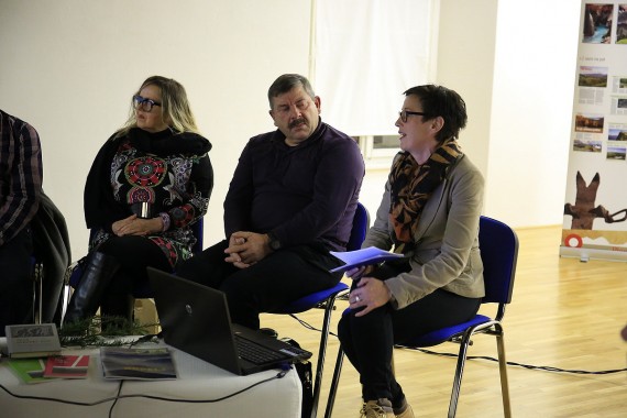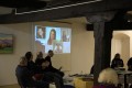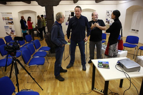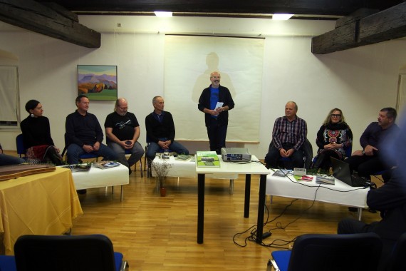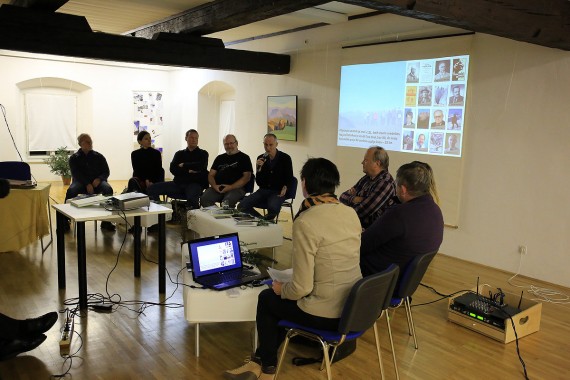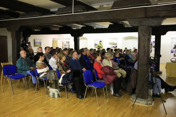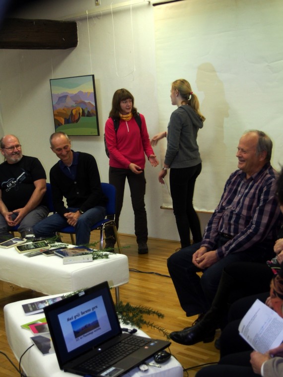 Polna dvorana poslušalcev je po planinskih poteh in zgodovini Planinskega vestnika stopala v družbi njegovih ustvarjalcev. Razstava je v Galeriji Magazin nad Mestno knjižnico in čitalnico Idrija na ogled še do 16. decembra. (foto Branko Podgornik)