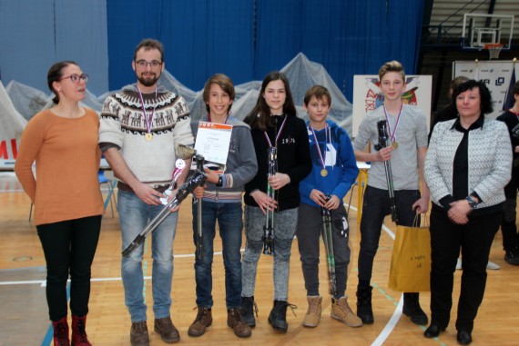 Osnovnošolski zmagovalci 28. državnega tekmovanja Mladina in gore Obriti orli iz Trzina z mentorjem Jako Peternelom (foto Manca Čujež)
