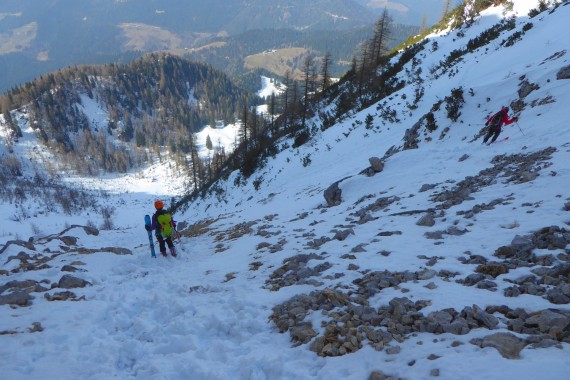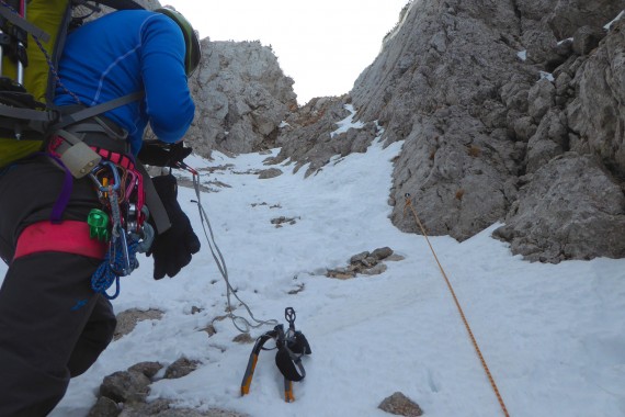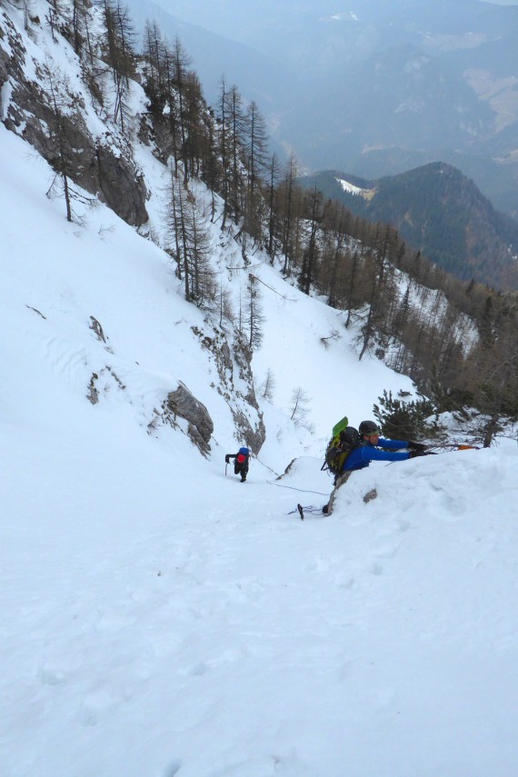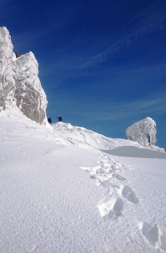 Izpitna tura je bila na vrsti dober mesec po tečaju, točneje v soboto, 18. marca 2017. Zbrali smo se na Grohotu, nato pa se po Stanetovi smeri povzpeli na Raduho. Sledil je sestop čez Durce. Vsi udeleženci so pokazali ustrezno znanje za varno vodenje zahtevnih snežnih tur.