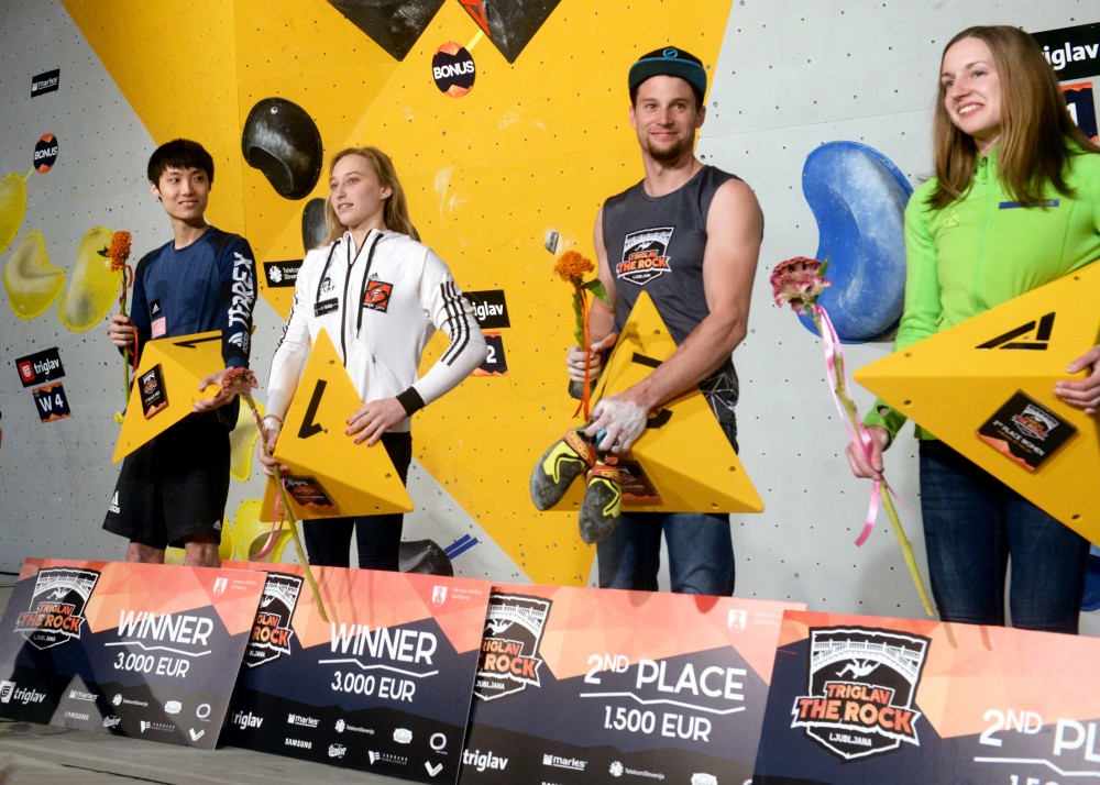 sobota, 20. maj 2017, ob 23.50 uri, ogledov: 5740 Janji Garnbret premierna izvedba Triglav The Rock Ljubljana, Katja Kadič in Jernej Kruder drugaŠportno plezanje | | Komisija za športno plezanje | | | Objavil(a): Manca Ogrin | | Premierno izvedbo mednarodnega tekmovanja v športnem plezanju v disciplini balvani Triglav The Rock Ljubljana je zaznamovala dvojna slovenska zmaga. V ženski konkurenci je zmagala Janja Garnbret, drugo mesto je pripadlo Katji Kadič, Chon Jongwon iz korejskega Seula je slavil zmago pri moških, Jernej Kruder je bil drugi. Mina Markovič in Domen Škofic sta bila peta, Urška Repušič pa šesta. Čestitke! | Kljub nekoliko kislemu majskemu vremenu je bil ljubljanski krst