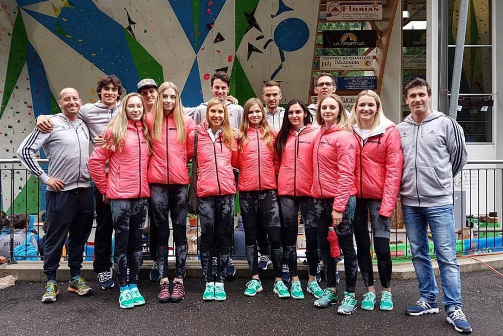 Lukan, Mia Krampl, Veronika Meke in Tjaša Kalan, zadaj plezalci Martin