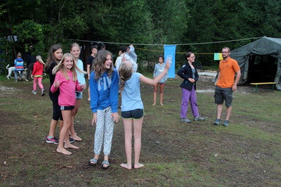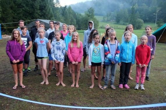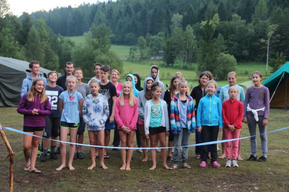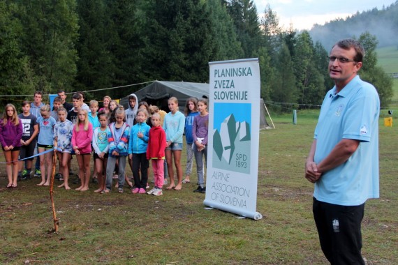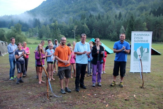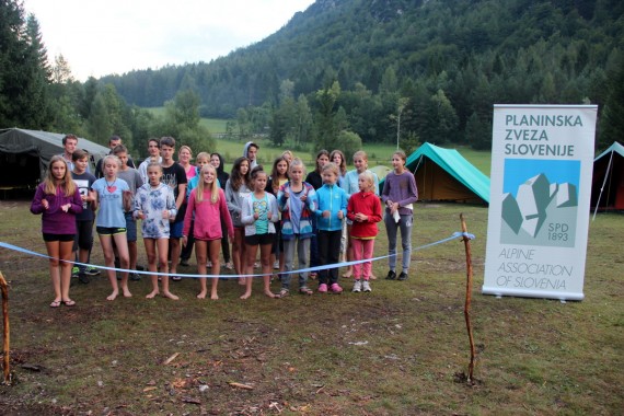 Mladi planinci PD Ljubljana-Matica in povabljeni na odprtju tabornega prostora v Mlačci (foto Manca Čujež)