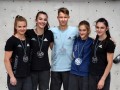 Vita Lukan, Lučka Rakovec, Luka Potočar, Lucija Tarkuš in Mia Krampl na zmagovalnem odru tekme evropskega pokala v Brunecku (foto slovenska mladinska reprezentanca v športnem plezanju)