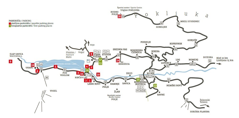 Med 23. junijem in 16. septembrom je ob petkih, sobotah in nedeljah organiziran brezplačni avtobusni prevoz iz parkirišča v Srednji vasi (Senožeta) in Stare Fužine. Celodnevna parkirnina znaša 2 €. Obratuje tudi parkirišče Vorančkojca ob cesti proti Vojam in Blatu - parkirnina stane 1,5 € na uro.