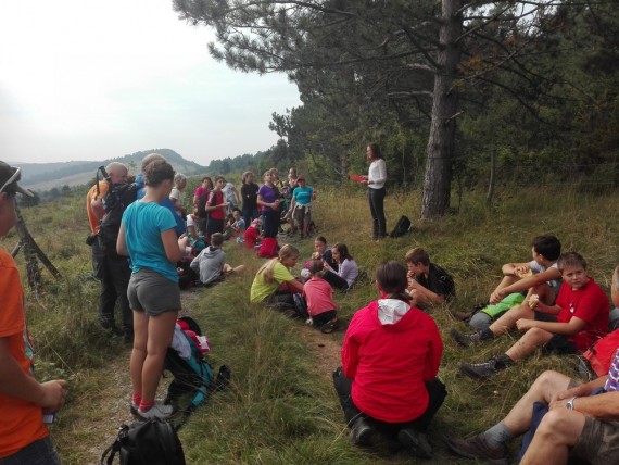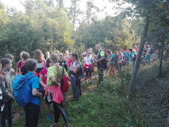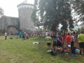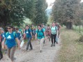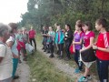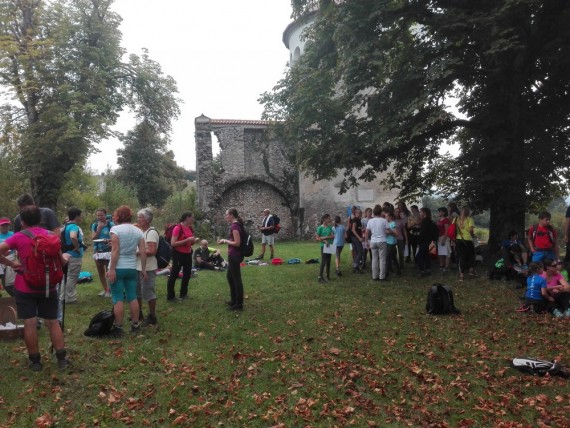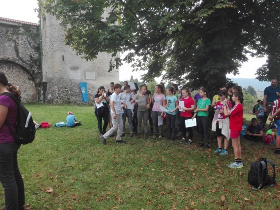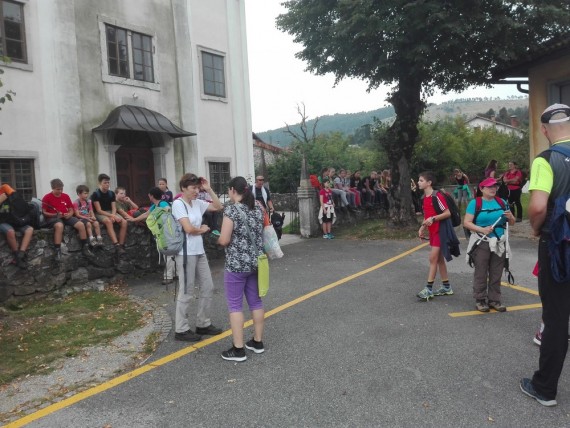 Nato smo se odpravili še na zadnji del poti, proti gradu Kalec. Hitro smo prišli do kostanjevega drevoreda, kjer se pasejo konji. Drevored vodi do ostankov gradu, najbolj je ohranjen stolp. Tu so bili že zbrani udeleženci pohoda iz Ilirske Bistrice, Bača in Knežaka. Bilo jih je kar 140, vseh skupaj nas je bilo tako blizu 200! Bilo je zelo živo in prijetno. Tudi mi smo posedli po travi. Hiteli smo jemati hrano iz nahrbtnika in pridno polniti naše želodčke.