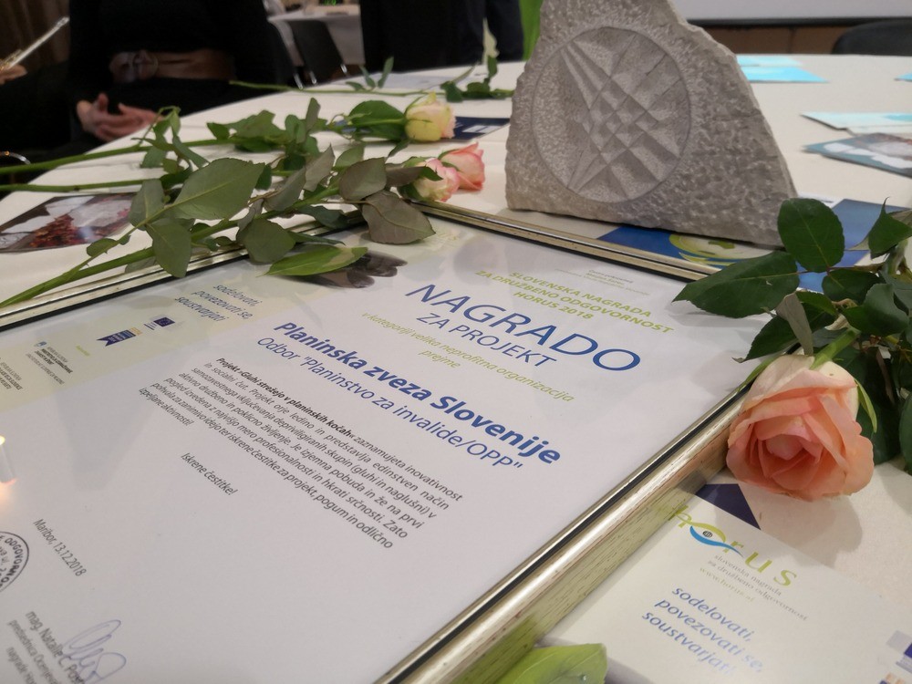 V četrtek, 13. decembra 2018, so bila v Mariboru podeljena letošnja priznanja in nagrade v okviru projekta Slovenska nagrada za družbeno odgovornost HORUS 2018. Nagrade in priznanja podeljujeta IRDO – Inštitut za razvoj družbene odgovornosti in PRSS – Slovensko društvo za odnose z javnostmi, v sodelovanju s številnimi podpornimi partnerji projekta. V kategoriji »Velika neprofitna organizacija« je za projekt »Gluhi strežejo v planinskih kočah« nagrado prejel Odbor PZS Planinstvo za invalide/OPP