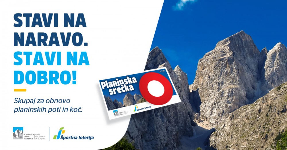 četrtek, 6. junij 2019, ob 10.20 uri, ogledov: 7758 Nova Planinska srečka - za obnovo slovenskih planinskih poti in kočDruštva | Koče | Poti | | Komisija za planinske poti | Gospodarska komisija | | | Objavil(a): Manca Ogrin | | Stavimo na naravo, stavimo na dobro! Planinska srečka je rezultat partnerstva med Planinsko zvezo Slovenije in Športno loterijo, njen namen pa je zbrati sredstva za obnovo slovenskih planinskih poti in koč. Kupiti jo je mogoče na vseh prodajnih mestih Športne loterije, na spletni strani www.e-stave.com, od 17. junija bo na voljo tudi v Planinski trgovini PZS. | Planinska srečka je rezultat partnerstva med Planinsko zvezo Slovenije, ki je največja športna zveza pri nas, in Športno loterijo. Namen Planinske srečke kot dela družbeno odgovornega delovanja obeh partnerjev je zbrati sredstva za obnovo slovenskih planinskih poti in koč. V Sloveniji imamo 10.014 km planinskih poti in 178 planinskih koč, zavetišč in bivakov, ki potrebujejo stalno skrb in vzdrževanje. Zbrana sredstva bodo usmerjena v obnovo, hkrati pa želimo pri Planinski zvezi Slovenije in Športni loteriji vzpodbuditi javnost k razmišljanju o pomenu naravnih danosti Slovenije.