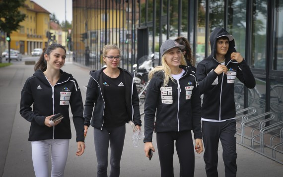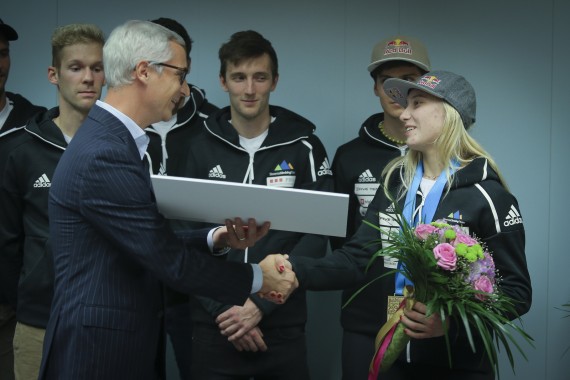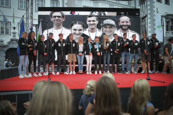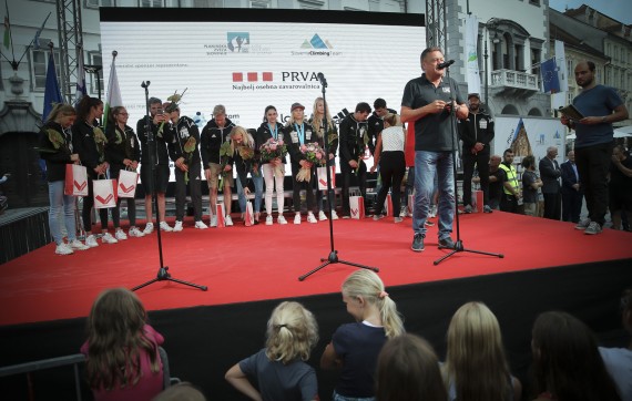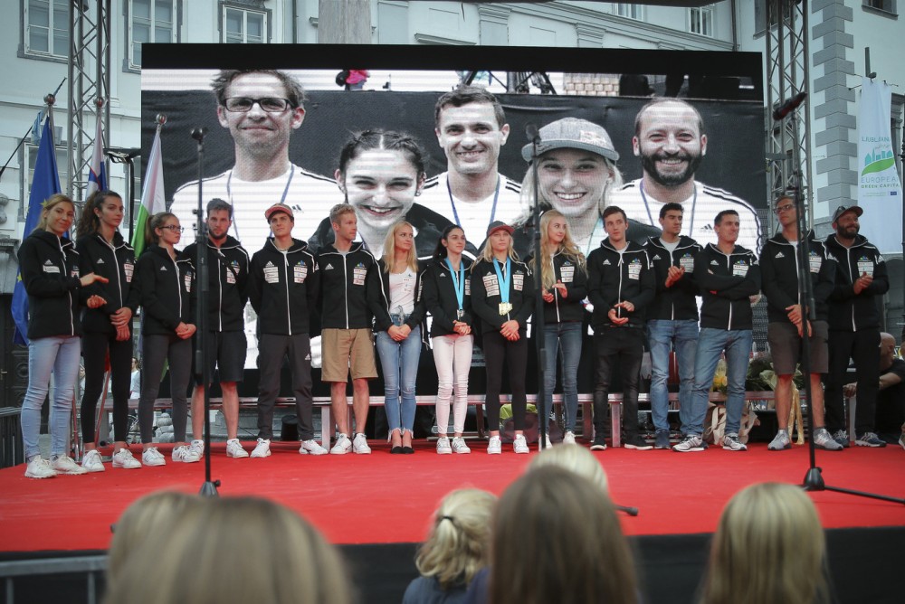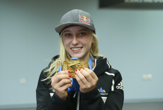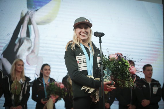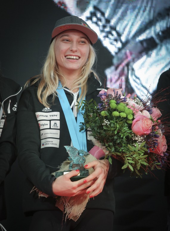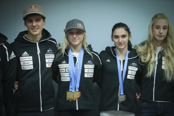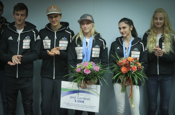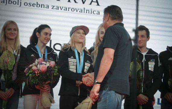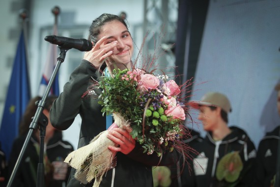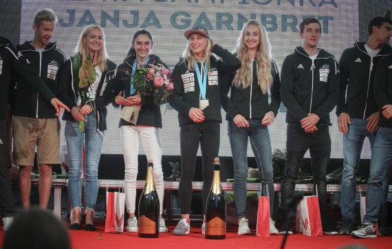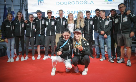 Dobrodošlica za športne plezalce s srebrno Mio Krampl in trikrat zlato Janjo Garnbret na čelu (foto Jože Suhadolnik/Delo)