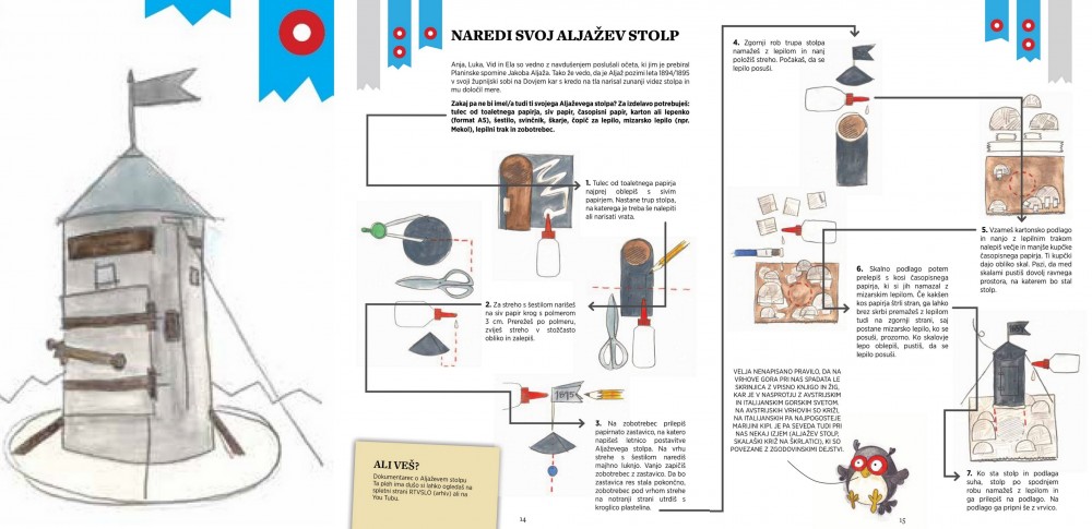 Naredi svoj Aljažev stolp Anja, Luka, Vid in Ela so vedno z navdušenjem poslušali očeta, ki jim je prebiral Planinske spomine Jakoba Aljaža. Tako že vedo, da je Aljaž pozimi leta 1894/1895 v svoji župnijski sobi na Dovjem kar s kredo na tla narisal zunanji videz stolpa in mu določil mere. Zakaj pa ne bi imel/a tudi ti svojega Aljaževega stolpa? Za izdelavo potrebuješ: tulec od toaletnega papirja, siv papir, časopisni papir, karton ali lepenko (format A5), šestilo, svinčnik, škarje, čopič za lepilo, lepilo, lepilni trak in zobotrebec.
