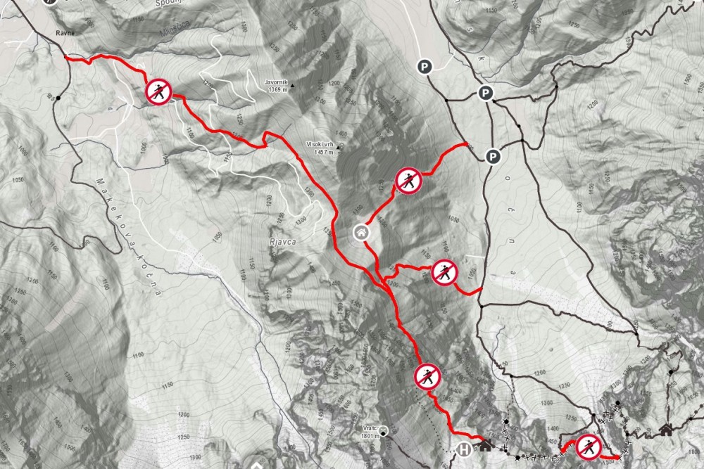 ZAPRTA ostaja planinska pot iz smeri Kranjske koče na Ledinah (čez Žrelo).