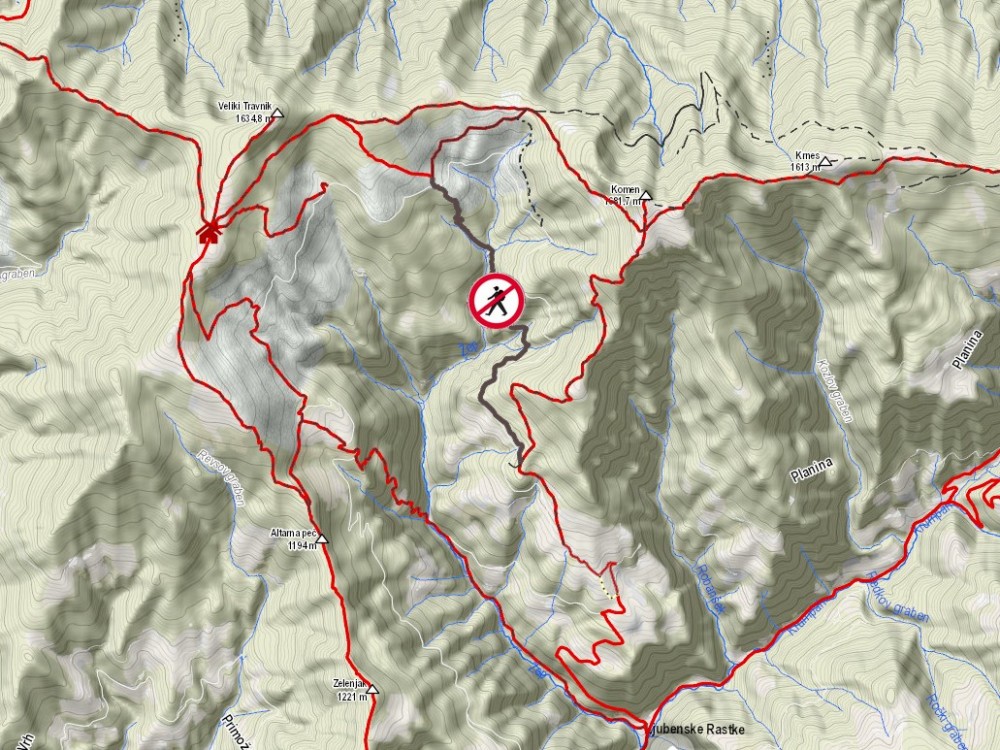 OBVESTILO UPORABNIKOM PLANINSKIH POTI: Uporabnikom planinskih poti priporočamo, da se na spletni strani stanje-poti.pzs.si, v bližnji planinski koči ali pri lokalnem planinskem društvu predhodno informirajo o dejanskem stanju planinskih poti. Če opazite poškodbe planinskih poti ali njihovo neustrezno urejenost (obledele markacije, zaraščenost ipd.), prosimo, da na naslov poskodbe.poti@pzs.si pošljete sporočilo, v katerem navedite, na kateri planinski poti ste opazili pomanjkljivost in pomanjkljivost opišite ter če je možno, dodajte tudi fotografijo.