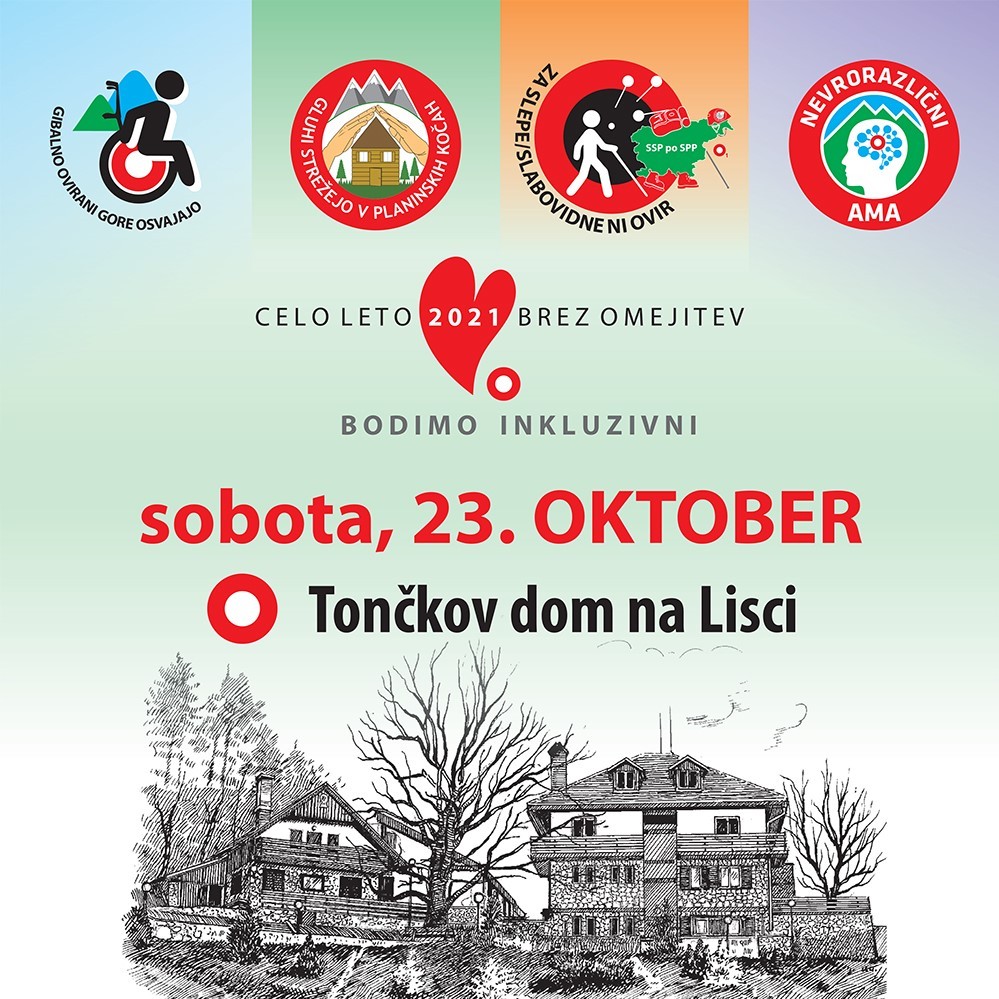 torek, 19. oktober 2021, ob 0. uri, ogledov: 2842 Zaključni inkluzijski pohod akcij GOGO, nevrorazlični AMA, Gluhi strežejo in slepihSplošno | | Planinstvo za invalide | | | Objavil(a): Marjeta Čič | | Vabljeni na inkluzijski pohod, 23. oktobra 2021, na Lisco. Akcije Gibalno ovirani gore osvajajo (GOGO) , Skupaj v hribe Nevrorazličini AMA (avtizem, motnja v duševnem razvoju, ADHD) in Slepi in slabovidni planinci se med seboj povezujejo. Na poti nam bodo delali družbo prostovoljci. Vsak v svojem tempu in na svoj način na cilj. Izberete lahko med dvema različnima potema z istim ciljem - Tončkov dom na Lisci, kjer nas pričakujejo prostovoljci akcije Gluhi strežejo v planinskih kočah. | Naši pohodi so obiskani in prijetni. Posebej lepo vas vabimo na zaključni inkluzijski pohod Skupaj v hribe. Namen pohoda je, zraven gibanja, spoznavati naravo in zanimivosti, ki jih ponuja narava z inkluzijskim pristopom, ko lahko skupaj vsak v svojem tempu in na svoj način doživlja pohod. inkluzija je proces, pri katerem se učimo živeti drug z drugim. Izberete lahko med dvema potema, na katerih nas bodo spremljali prostovoljci in planinski vodniki.