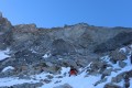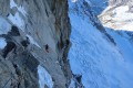 Za dostop sva si izbrala nočno smučanje v gorniških čevljih po Valle Blanche. Tudi težka nahrbtnika nista pripomogla k izboljšanju dokaj akrobatske tehnike smučanja, vendar je bila taktika časovno učinkovita. Na začetku smeri nama je kar nekaj preglavic povzročila tudi krajna zev, nato pa je v lažjih začetnih raztežajih steklo bolj gladko. Kratek januarski dan sva zaključila na začetku osrednjega strmega dela smeri. Ob pomanjkanju za bivak primernih polic sva si pomagala z visečimi mrežami.