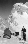 Fotografija levo: Dušan Kukovec (spredaj) in Janez Resnik, prvi bivak med plezanjem prve takrat jugoslovanske ponovitve klasične smeri v severni steni Eigerja, ki sta jo v 26 urah preplezala med 23. in 24. julijem 1969. // Fotografija desno: Med zimskim prečenjem Kamniško-Savinjskih Alp, ki je v tistih časih veljalo za pravi podvig, ki ga je Dušan opravil s soplezalcem Vančem Potrčem. (foto osebni arhiv)
