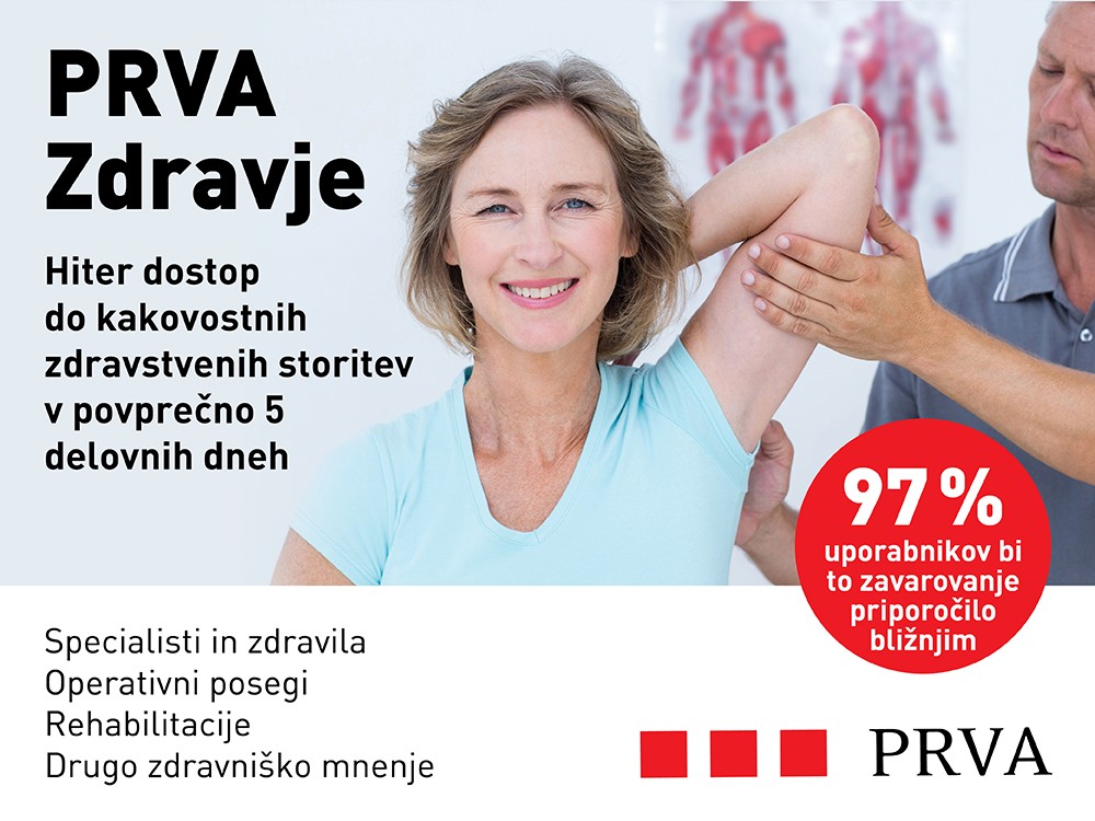 sobota, 19. marec 2022, ob 8.30 uri, ogledov: 1613 Postavite zdravje na prvo mestoReklamno sporočilo | | | REKLAMNO SPOROČILO | Objavil(a): Matej Ogorevc | | Ko nas doletijo zdravstvene težave, je ključen dejavnik za uspešno ozdravitev čas. Ob dolgih čakalnih vrstah v javnem zdravstvenem sistemu se utegnejo pojaviti dodatni zdravstveni zapleti. Sedaj lahko to, da bi se vam zdravstveno stanje poslabšalo zaradi predolgega čakanja, preprečite. Dodatno zdravstveno zavarovanje PRVA Zdravje vam ob novonastali bolezni ali poškodbi zagotavlja hiter dostop do diagnoze in zdravljenja pri zasebnih izvajalcev zdravstvenih storitev. | V povprečno 5 delovnih dneh do diagnoze in zdravljenja