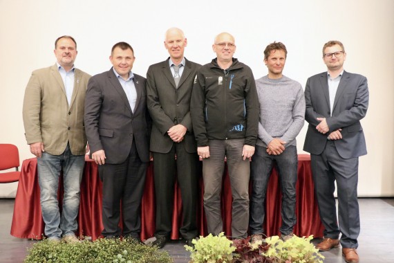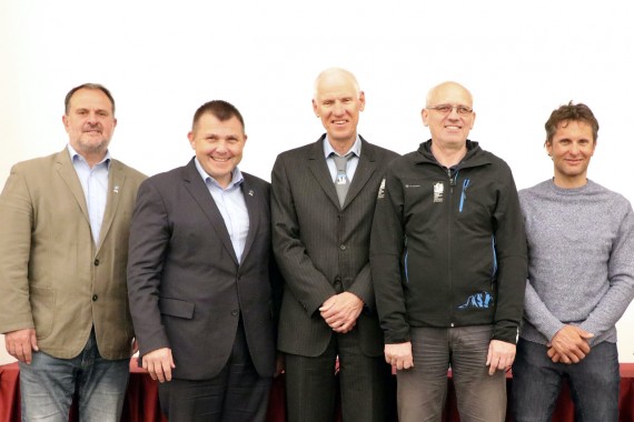 Novo predsedstvo Planinske zveze Slovenije: podpredsednika Martin Šolar in Roman Ponebšek, predsednik Jože Rovan, podpredsednika Jožef Bobovnik in Miha Habjan ter generalni sekretar Damjan Omerzu (foto Manca Ogrin)