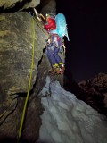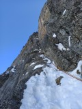 Do 20:48 preplezava po skici sodeč vse težje raztežaje, ki ponujajo plezalne raztežaje težavnosti v skali do M6 ter v ledu do WI5. Priplezava namreč do Exit Cracka, medtem ko se dnevna svetloba ravno odpravi k počitku. Bližajoča noč naju skoraj ne gane, saj sva z mislimi že na vrhu. Pa vendarle naju je moment slabe koncentracije stal noči. Po Exit Cracku prehitro nadaljujeva po prečnici v levo, zavoj strmo v desno in naenkrat se znajdeva v žlebu preveč desno. Po začetnih poskusih nama ni čisto jasno od kje so se pojavile take težave, hkrati se zavedava utrujenosti od celega dne in težave pripisujeva bolj le tej. Na vsake toliko za kakšnim previsnim vogalom iz pod snega izkopljeva kakšen star klin, kar nama vlije upanja, da sva prav in se tolaživa ter nadaljujeva. Verjetno je dovolj zgovoren podatek ta, da sva do 6h zjutraj izplezala tri raztežaje nekih strmih kaminov in čudnih prečk v levo in desno. Dokler se zopet ni prikazala dnevna svetloba, se sploh ne zaveva, da nama je kanal vzel celo noč. Žgoča meča naju pospremijo še po zadnjih trdih raztežajih črnega ledu po strehi Eigerja in tako ob 8. zjutraj doseževa vrh strehe.