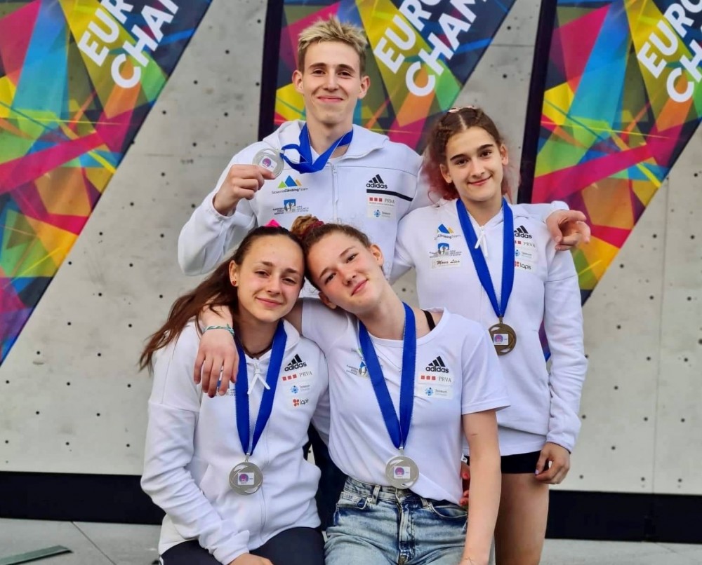 ponedeljek, 18. julij 2022, ob 11. uri, ogledov: 1736 Štiri medalje mladih plezalcev z evropskega prvenstva v težavnostiŠportno plezanje | Društva | | Komisija za športno plezanje | | | Objavil(a): Barbara Gradič Oset | | V nemškem Augsburgu je bilo evropsko mladinsko prvenstvo v težavnosti. Sara Čopar, Lucija Tarkuš, Jennifer Buckley in Timotej Romšak so domov prinesli medalje in potrdili dobro letošnjo sezono v težavnostnem plezanju. | Na zadnjem evropskem prvenstvu v težavnostnem plezanju so mladi športni plezalci osvojili štiri medalje. 17-letna Sara Čopar (PO PD Celje Matica) je med kadetinjami zasedla 2. mesto, 18-letna Lucija Tarkuš (AK IMPOL Slovenska Bistrica) v kategoriji mladink 3. mesto, 17-letni Timotej Romšak (PK Kamnik) v kategorije mladincev 2. mesto in mlada 15-letna Jennifer Buckley (Društvo za razvoj plezalne kulture) je osvojila 2. mesto v kategoriji starejše deklice. Selektorica mladinske reprezentance v športnem plezanju Ajda Remškar je zadovoljna z nastopi svojih varovancev na evropskem prvenstvu. " Konkurenca na prvenstvu je močnejša kot na pokalih, tako da me veseli, da so nekateri izmed naših reprezentantov uspeli prikazati svoje najboljše plezanje v letošnji sezoni. V številčni ekipi je seveda vedno kdo, ki ne odpleza najbolje, a finalisti v petih kategorijah in štiri medalje so lep izkupiček."