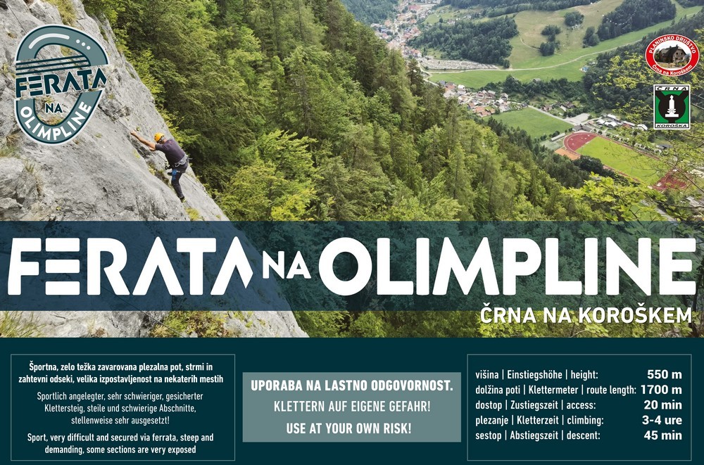 sreda, 24. avgust 2022, ob 10. uri, ogledov: 3996 FERATA NA OLIMPLINE| Nova ferata na KoroškemSplošno | Poti | | Planinsko društvo Črna na Koroškem | | | Objavil(a): Matej Ogorevc | | Iz središča Črne na Koroškem do zgornje postaje Olimplina je postavljena nova prava hribovska ferata, v večji meri ocenjena z oceno C. Najizkušenejši pa lahko izbirajo z več ločenimi odseki z ocenami D, E in F. Za ferato boste porabili med 4 in 5 urami. |