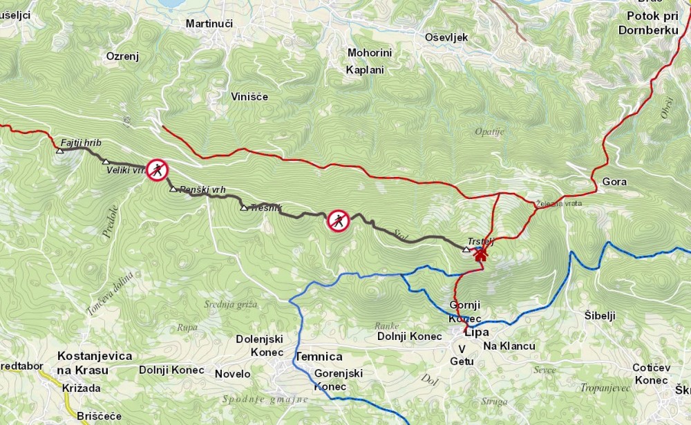 OPOZORILO: Uporabniki uporabljajo planinske poti na lastno odgovornost. Uporabniki planinskih poti morajo pri uporabi planinskih poti ravnati samoodgovorno in odgovorno do drugih tako, da ne ogrožajo ali poškoduje sebe ali drugega. Uporabnik je dolžan planinsko pot uporabljati tako, da se po njej ter na in ob zemljišču, preko katerega poteka in na drugih nepremičninah ter favni in flori ob njej ne dela škoda. Prepovedano je omejevati dostop na planinske poti ter poškodovati, odstranjevati ali uničevati markacije, usmerjevalne table, skrinjice in varovalno opremo in druge oznake ali uporabljati neoznačene bližnjice. |