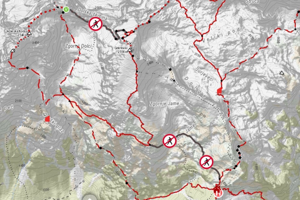 OBVESTILO UPORABNIKOM PLANINSKIH POTI: Uporabnikom planinskih poti priporočamo, da se na spletni strani stanje-poti.pzs.si, v bližnji planinski koči ali pri lokalnem planinskem društvu predhodno informirajo o dejanskem stanju planinskih poti. Če opazite poškodbe planinskih poti ali njihovo neustrezno urejenost (obledele markacije, zaraščenost ipd.), prosimo, da na naslov poskodbe.poti@pzs.si pošljete sporočilo, v katerem navedite, na kateri planinski poti ste opazili pomanjkljivost in pomanjkljivost opišite ter če je možno, dodajte tudi fotografijo.