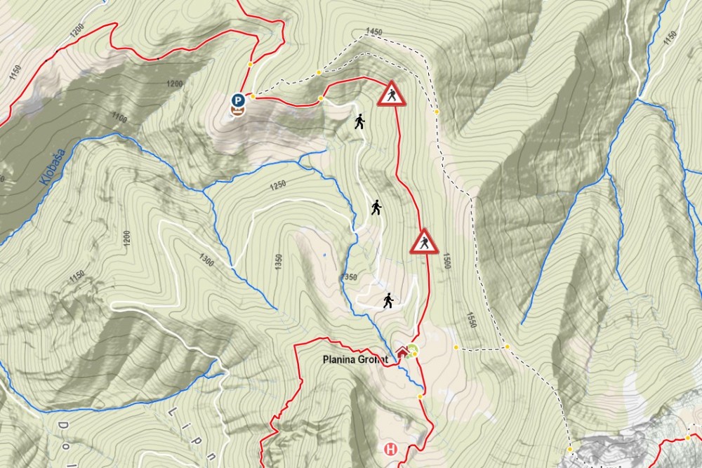 OPOZORILO: Uporabniki uporabljajo planinske poti na lastno odgovornost. Uporabniki planinskih poti morajo pri uporabi planinskih poti ravnati samoodgovorno in odgovorno do drugih tako, da ne ogrožajo ali poškoduje sebe ali drugega. Uporabnik je dolžan planinsko pot uporabljati tako, da se po njej ter na in ob zemljišču, preko katerega poteka in na drugih nepremičninah ter favni in flori ob njej ne dela škoda. Prepovedano je omejevati dostop na planinske poti ter poškodovati, odstranjevati ali uničevati markacije, usmerjevalne table, skrinjice in varovalno opremo in druge oznake ali uporabljati neoznačene bližnjice. |