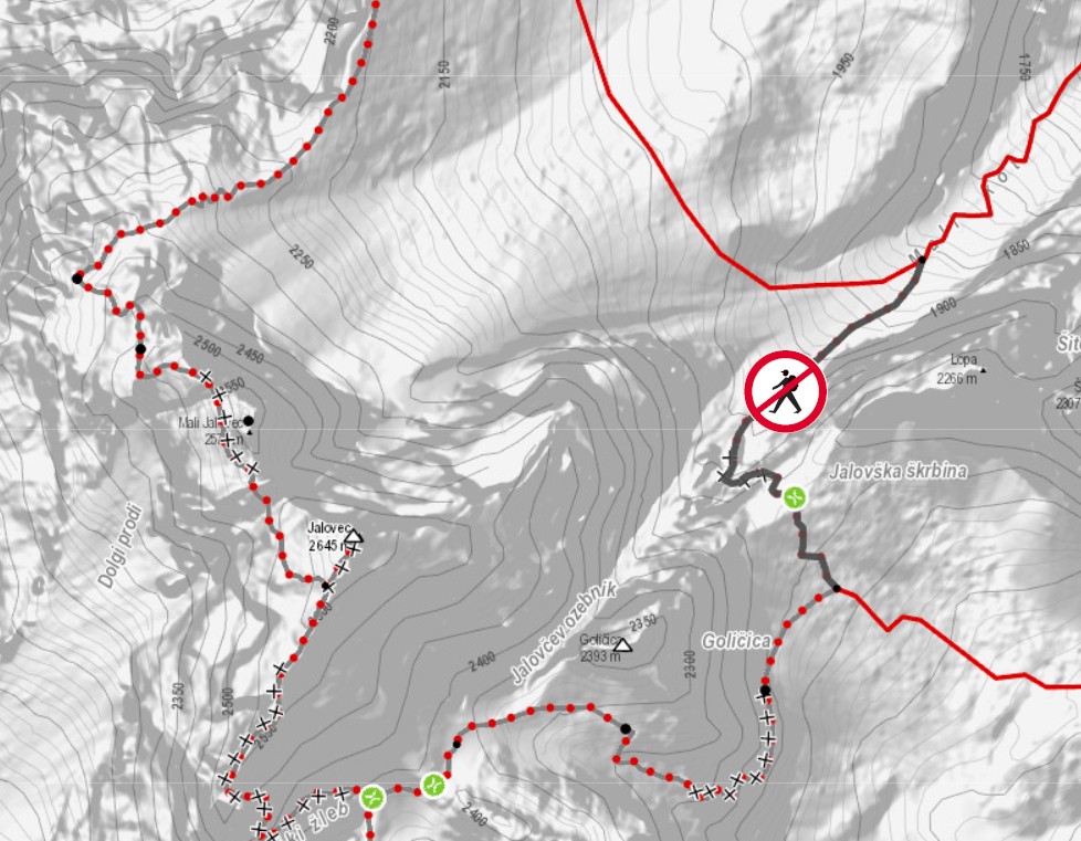 OBVESTILO UPORABNIKOM PLANINSKIH POTI: Uporabnikom planinskih poti priporočamo, da se na spletni strani stanje-poti.pzs.si, v bližnji planinski koči ali pri lokalnem planinskem društvu predhodno informirajo o dejanskem stanju planinskih poti. Če opazite poškodbe planinskih poti ali njihovo neustrezno urejenost (obledele markacije, zaraščenost ipd.), prosimo, da na naslov poskodbe.poti@pzs.si pošljete sporočilo, v katerem navedite, na kateri planinski poti ste opazili pomanjkljivost in pomanjkljivost opišite ter če je možno, dodajte tudi fotografijo.