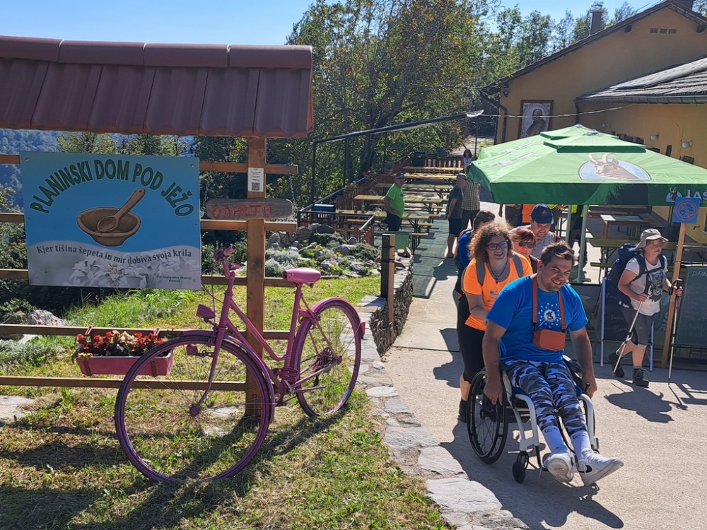 Na sliki moški v oranžni majici z gurtnami vleče invalidski voziče, ki ga potiska drugi moški, v ozadju so inPlainci, arhiv inPlaninec Medtem hojo po senčni cesti, smo se veselo pogovarjali in hitro smo dosegli naš cilj. Srečevali smo skupine večinoma angleških kolesarjev, ki so si prav tako uživali v razgibani cesti in razgledih. Celotna pot je merila 4 km in kljub temu, da je bila za nekatere naporna, je bila nagrajena z nepozabnimi razgledi in prijaznimi pozdravom osebja doma pod Ježo, ki leži 740 m nad morjem. Navdušeni smo bili nad sprejemom, že na cesti nas je pričakalo osebje doma in člani planinskega društva, ki so nas nasmejani pozdravili. Po takšni prisrčni dobrodošlici smo se res počutili zaželeni gostje.