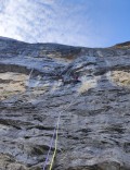Med potikanjem po Grindelwaldu smo lahko prve dni od daleč preverjale razmere v S steni Eigerja. Na začetku tedna je bila stena očitno posnežena od zadnjih padavin. Kakšen dan kasneje so se po steni cedili le še mokri trakovi, a vendar nas je spremljal občutek, da nam stena lahko ne odpre svojih vrat, saj temperature niso bile ugodne. Faktor, po katerem se alpinisti ozirajo na to ali so razmere v S steni Eigerja primerne za plezanje v poletnem času ali ne, je višina temperature v dolini. Če ta znaša 30° ali več, naj bi bile razmere ugodne. Proti koncu tedna pa je sledila zelo optimistična napoved, brez popoldanskih padavin. Ozračje se je segrelo in šle smo preverit, kaj to za naše plezanje v Eigerju pomeni. Ko sva s Saro prvič dostopali pod Eiger, sva ugotovili, da so temperature višje bolj prijetne kot v dolini, zato sva dostopali začuda v kratkih rokavih. Med plezanjem smeri Ratatat sva v sosednji liniji srečali dobrega poznavalca stene, ki je ravno zaključeval novo smer. Omenil nama je, da so trenutno v steni presenetljivo dobri pogoji za plezanje in da jih naj izkoristimo, saj je ugodna temperatura v S steni Eigerja tudi sredi poletja redkost in je zato po navadi plezanje v njej manj prijetno tudi z vidika težavnosti. Tako smo nekatere zadnje dva dni izkoristile v Eigerju.