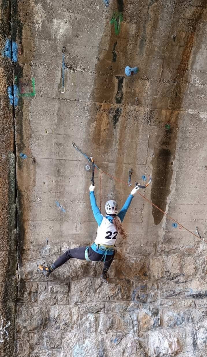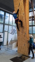 Maja Šuštar Habjan čez lesene sodčke proti vrhu finalne smeri (foto Andreja Ravljen)