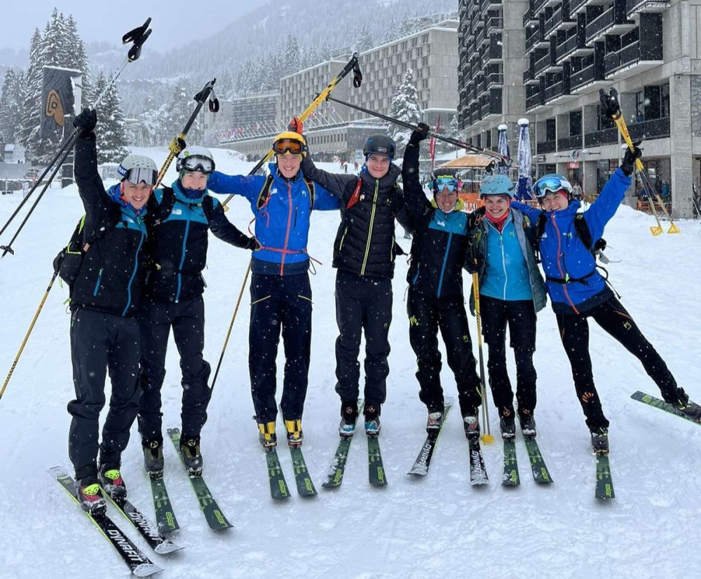 Slovenska reprezentanca v tekmovalnem turnem smučanju na EP Flaine-Chamonix 2024: Luka Kovačič, Jon Pritržnik, Maj Pritržnik, Klemen Španring, Rea Kolbl, Klara Velepec in Ana Čufer (foto Robert Pritržnik)