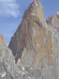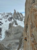 "Konec februarja in polna luna po navadi prineseta kakšno večdnevno okno lepšega vremena in tudi tokrat so obeti kazali v to smer, a kot da stvari ne bi bile dovolj začinjene, je zadnje neurje, dan pred izboljšanjem, večino sten odelo v sneženo obleko. Najina se je zaradi strmine na srečo temu izognila, zato sva kljub mrazu začela snežen dostop ter prvi dan splezala osem raztežajev in bivakirala. Drugi dan sva dopoldne preplezala še preostale znane metre in z najkrajšimi klini na pasu zagrizla v neznani teren. Po nekaj tehničnega plezanja so sledile sanje vsakega plezalca novih smeri v obliki neverjetnih prehodov in prvovrstne skale. Poči, na katere bi bila ponosna vsaka yosemitska klasika, so nama privabljale nasmeh na obraz. Nestrpno sva pogledovala navzgor in bila nagrajena z odlično polico za bivak sredi strme stene. Tretji dan naju je za zajtrk pričakala previsna poč, potem pa še široka streha, vidna že iz Chaltena, in popoldne sva se znašla v manj strmem terenu. Zadnjih dvesto metrov lažjega plezanja sva si delila z Whillansovo smerjo, a se je utrujenost in teža opreme, ki jo je bilo treba začeti nositi, začela že precej poznati. Na vrhu sva bila nagrajena s skorajšnjim brezvetrjem in živo žarečim sončnim zahodom, ki skupaj z notranjim mirom ni potreboval besed. Bilo nama je jasno, da sva se znašla v trenutku, ki nam je redko dan doživeti. Dvajset metrov pod vrhom sva si na zagozdenem balvanu pod streho uredila še tretji bivak ter ob nepozabni predstavi narave in prijetni debati počasi zaspala. Ponoči naju je zbudilo sneženje, ki je pobelilo stene in jo zagodlo navezam, ki so bile še v smereh. S spusti ob vrvi sva sestopila po smeri Whiskey time v vzhodni steni, uspešno znavigirala med opastmi in razpokami do Lagune De los Tres ter zvečer konkretno utrujena, peti dan po odhodu, prišla nazaj v El Chalten," plezalno epopejo sklene starejši od celjskih alpinistov, Luka Krajnc.