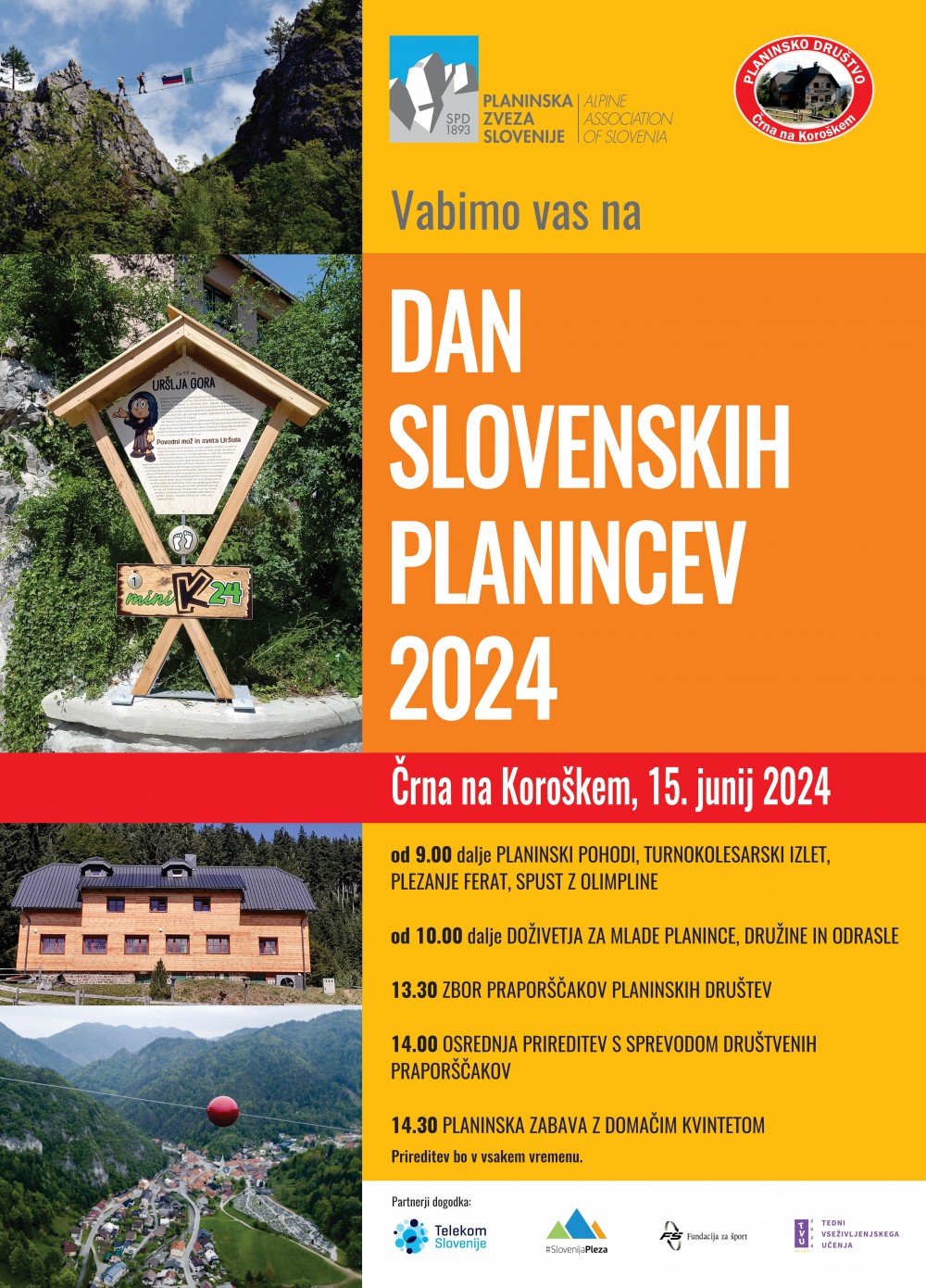 od 9.00 PLANINSKI POHODI, TURNOKOLESARSKI IZLET, PLEZANJE FERAT, SPUST Z OLIMPLINE-om od 10.00 DOŽIVETJA ZA MLADE PLANINCE, DRUŽINE IN ODRASLE na prireditvenem prostoru, v centru Črne, na smučišču Črne: delavnice in predstavitve, plezanje, mini K-24 13.30 ZBOR PRAPORŠČAKOV PD v avli Kulturnega doma Črna 14.00 OSREDNJA PRIREDITEV s SPREVODOM PRAPORŠČAKOV na prireditvenem prostoru pred Kulturnim domom Črna 14.30 PLANINSKA ZABAVA na prireditvenem prostoru z domačim kvintetom