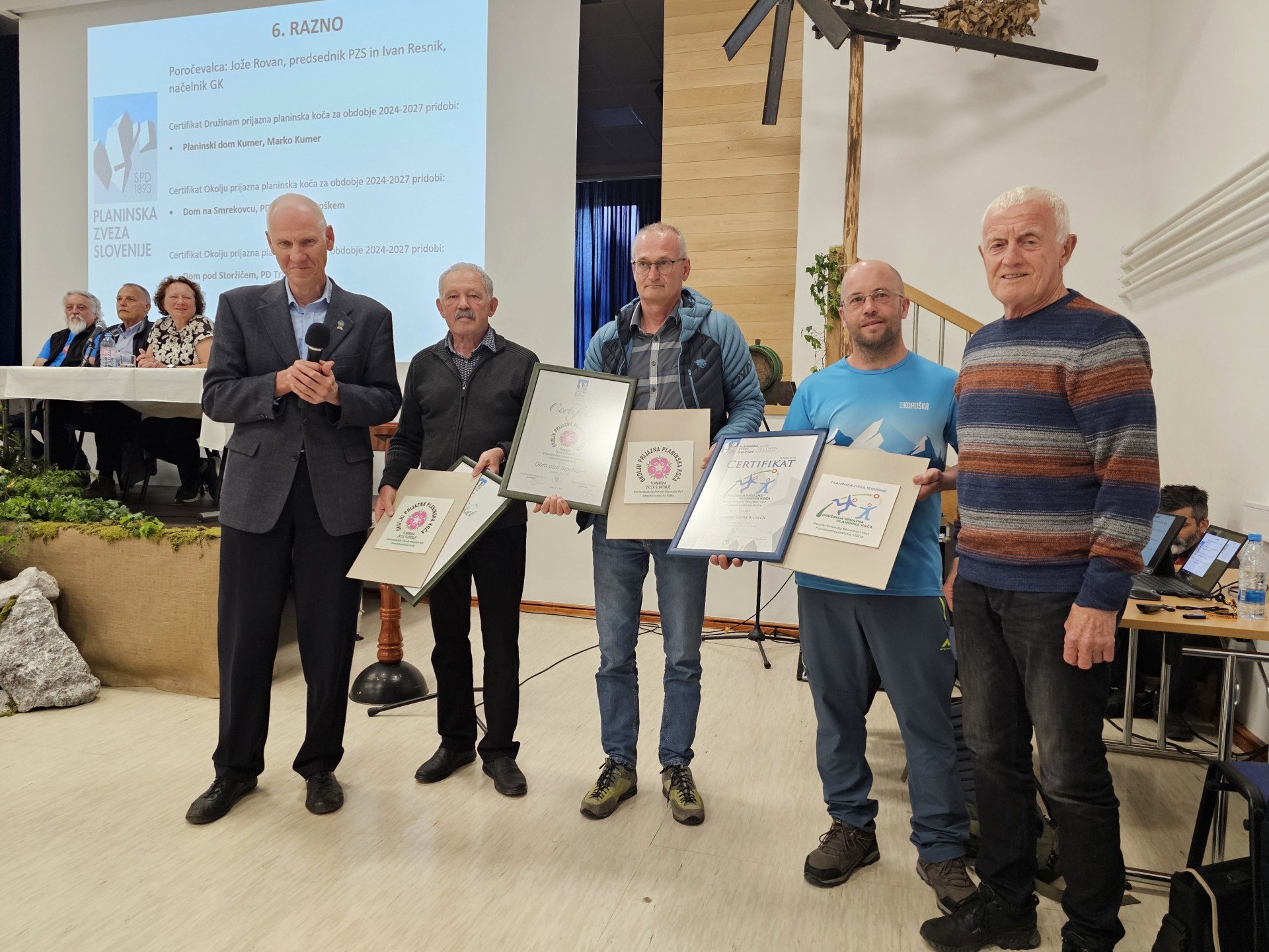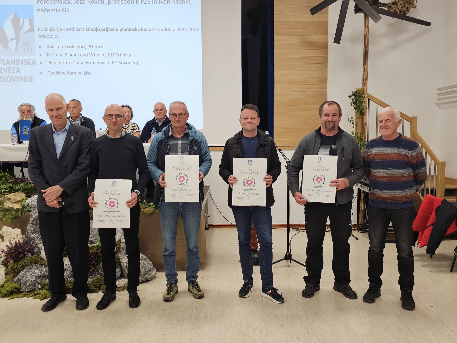 Novi prejemniki certifikatov družinam (Planinski dom Kumer) in okolju prijazna planinska koča (Dom na Smrekovcu in Dom pod Storžičem) s predsednikom PZS Jožetom Rovanom in načelnikom Gospodarske komisije PZS Ivanom Resnikom; podaljšanje certifikatov je prejelo še 15 družinam in 4 okolju prijazne planinske koče. (foto Manca Ogrin)