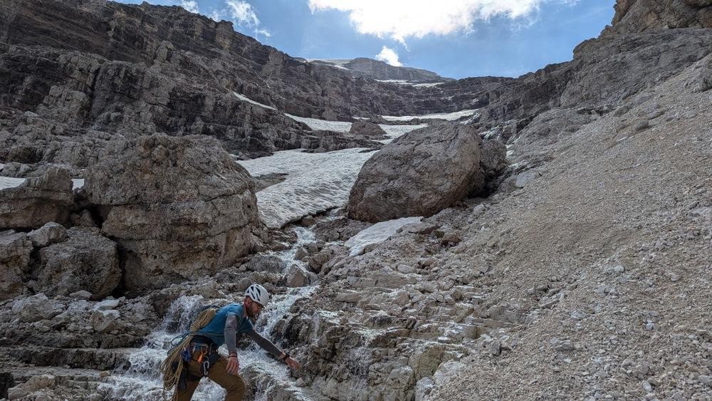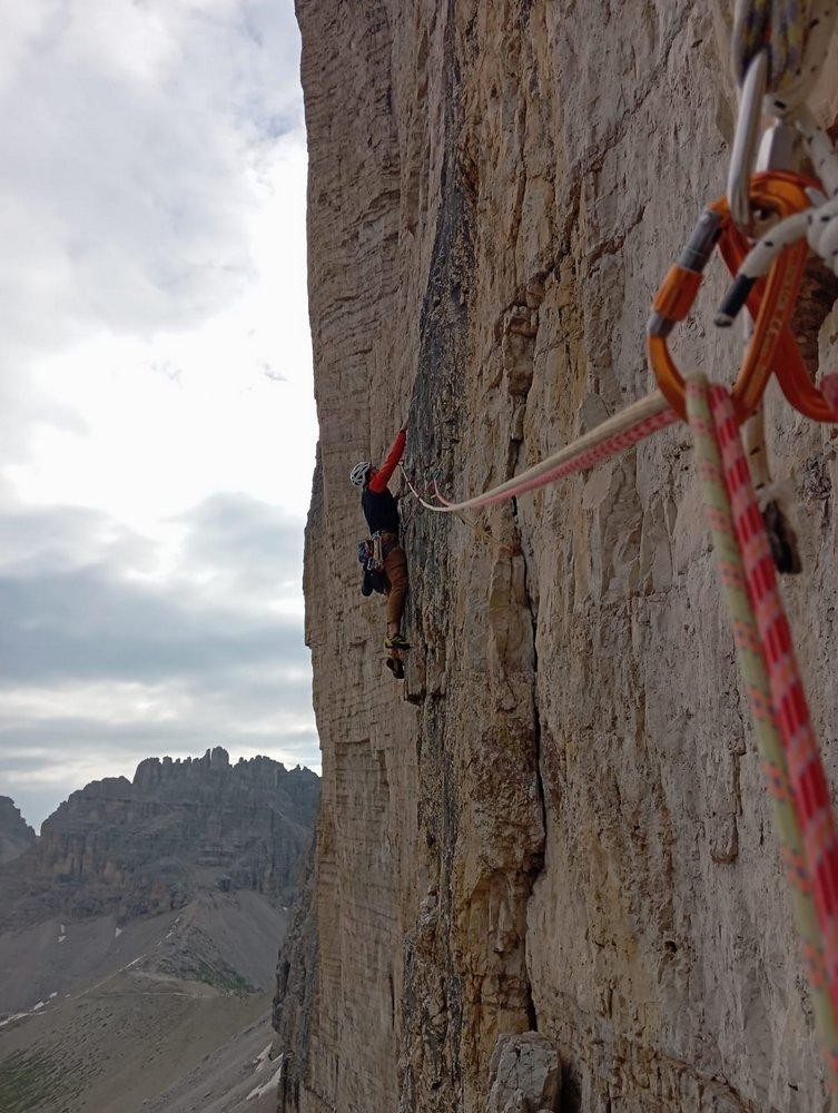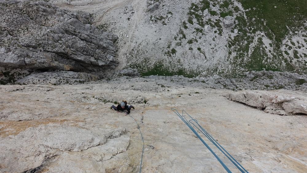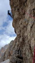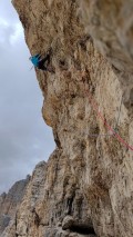 Osmi dan tabora smo se že malo utrujeni, a polni motivacije ponovno spravili v hribe. Jaz in Matic D. sva se odpravila v glavni vrh področja Rosengarten - Rosengartenspitze. V nekem starem vodničku sva našla tehnično smer Leveto-Namela (600 m, VII+), ki je imela v prvih petih raztežajih pripisano oceno 6 A0. Smer rine po minimalističnih razčlembah mimo previsov in streh ter nudi pravo atletsko plezanje. Proste ocene prvih petih raztežajev se gibljejo med VII- in VII+. Vrhnji del smeri sestavljajo kompaktne dolomitske petice, ki te pripeljejo do roba stene. Sestop gre mimo štirih planinskih koč, a pogled na uro nama ni pustil postanka. Na vrhu sva bila približno ob 16.30, zadnja gondola pa gre v dolino ob 18.30. "Kaj misliš, a bova ujela?", pravi Matic in že tečeva proti jeklenici. Noge po sedmih dneh plezanja in z vso bojno opremo na hrbtu ne dajo kaj dosti več od sebe. Dol še gre, gor pa bolj počasi. Do zgornje postaje žičnice sva prišla celo 5 minut prezgodaj in požela kar nekaj čudnih pogledov lahkotnih trailrunnerjev, ki so ravno dobro zaključevali z raztezanjem po treningu. Žiga je že nekaj dni navijal za krajšo smer Semifredo (220m, IX) nedaleč stran od prelaza Pordoi, ki baje še nima ponovitve. V soboto se ga je usmilil Rok in oba sta v drugem poizkusu prosto preplezala težji raztežaj. Posebnost te smeri je, da kljub oceni nima niti enega svedra, kot je to v navadi v bolj plezanih težjih smereh v Dolomith. Pravita, da je 7c soft in malo podrt z dokaj dobrimi možnostmi za varovanje.
