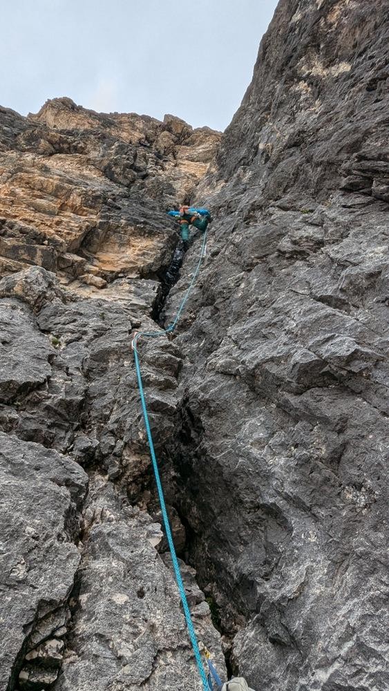 Naslednji dan z Žigom optimistično dostopava pod južno steno Tofane z namenom plezanja smeri Sognando Aurora (540 m, 7b+), vendar hitro opaziva, da je spodnji del smeri precej zamočen. Z negotovostjo kljub temu vstopiva in preplezava par raztežajev šestice do vrha mokrega dela, kjer Žiga med motoviljenjem na sidrišču v brezno pošlje eno od plezalk. Po vrvi se spustiva do vznožja stene, kjer naju pričaka izgubljen čevelj. Zaradi časovne stiske in ne preveč dobrega vremena hitro spremeniva cilj in se zapodiva v smer Il Vecchio Leone e la Giovane Fifona (260 m, 7a), s katero sva delno v štajercu opravila v približno dveh urah. Eva in Urh sta imela to srečo, da je bila njuna načrtovana smer Paolo VI popolnoma mokra in jima je bila dilema o vzponu prihranjena. Hitro sta stopila pod steno levo in desno, da sta našla alternativo. Še dobro, da pod Tofano lovi 5G. Na koncu sta se lotila smeri Il Mio Cricketo (260 m, 7b), ki je delo Dejana Korena - Dekota in Stanke Vidmar. Smer je bolj malo plezana, ima pa po pričevanjih Eve in Urha nekaj več svedrov, kot jih je vrisanih na skici. Za razliko od naju z Žigom, ki sva se do vznožnja spustila po vrvi, sta Eva in Urh nadaljevala do vrha stolpa in sestopila po poti. Izstopajoč vzpon drugega plezalnega dne (in tretjega dne tabora), sta opravila Matic Grojzdek in Žiga Rozman, ki sta se po nekaj urnem pregovarjanju le zedinila in naslednji dan zgodaj zjutraj odrinila proti masivu Civette. Preplezala sta smer Carlesso-Sandri (900 m, VIII+/IX- / VI-VII) in se pozno ponoči oz. zgodaj zjutraj vrnila nazaj v Cortino.