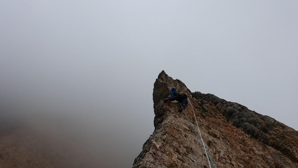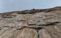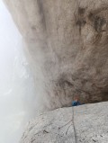 Tisti, ki so se tretji dan napenjali, so si četrti dan izbrali lažje smeri. Ostali, pa smo želeli popraviti slab okus preteklega dne z izbiro zahtevnejših podvigov. Jaz in Žiga sva si izbrala smer ISO 2000 (VIII+, 550 m) v Veliki Cini ter v navezo vzela našutanega perspektivca Roka Bernota. Smer se začne po dokaj svežem podoru, potem pa se stena postavi pokonci in je plezanje eno samo sosledje brezskrbnih gibov v odlični skali. V smeri je nekaj svedrov, ki so precej narazen, tako da orientacija včasih ni najlažja. Vsi smo se strinjali, de je detajl smeri četrti 40 m dolg raztežaj ocenjen z VIII- za katerega v vodničku piše nekako takole "...beware how you reach the two finger pocket and do not be fooled by the traces of chalk." Pa je šel sajt, pravi Rok ali Žiga. Doseči omenjeno luknjico za dva prsta ni enostavno in brez nje, bi bil prehod čez plato za nekaj ocen težji.