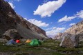 Bazni tabor smo postavili na ravnici ob bučni ledeniški reki (GPS 33°23'58.83"N, 76°46'32.94"E, 4482 m). Čista pitna izvirska voda, zelena trava in veliko cvetja. Manjkali niso niti zares dobri balvani. Nad bazo se je strmo dvigala vzhodna stena H17 (5800 m), iz globoke doline nismo videli našega glavnega cilja (T16, 6431 m). Vso vzhodno obzorje je zakrival divji svet ostrig skalnih grebenov in globokih dolin, ki se zajedajo v greben šesttisočakov, ki se vije od Haftal Kangrija (6178 m) preko T19 (6162 m), T18 (6184 m), T16 (6431 m), T13 (6436 m) pa vse do T9 (6107 m). Nič nismo počivali, ko smo prišli v bazo. Tomaž je razložil, da nimamo kaj čakati. Vreme je lepo in naložili smo si kar nekaj opreme ter po strmih morenah odšli proti stranskemu ledeniku, vzhodno iz doline Chhogo, v zatrep pod severno steno T13 (6436 m), kjer je leta 2016 taboril tudi Cosmin z njegovo ekipo. Na ledeniku smo na 5200 m naredili depo opreme.
