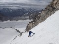 Vzpon v vzhodni steni v smeri Charlatan De Balkan (500 m, D+, led do 60°). V ozadju vrhovi pogorja Raru nad Tetleh Nalo, pod njim je ledenik Korlomshe. (foto Matija Jošt - Matic)