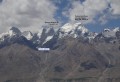 Pogled na severno steno Skarma Mindruk Ri iz samostana v Kharshi. Rdeče je vrisana Šentjurska smer